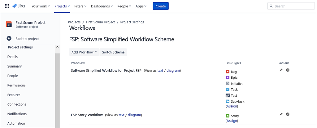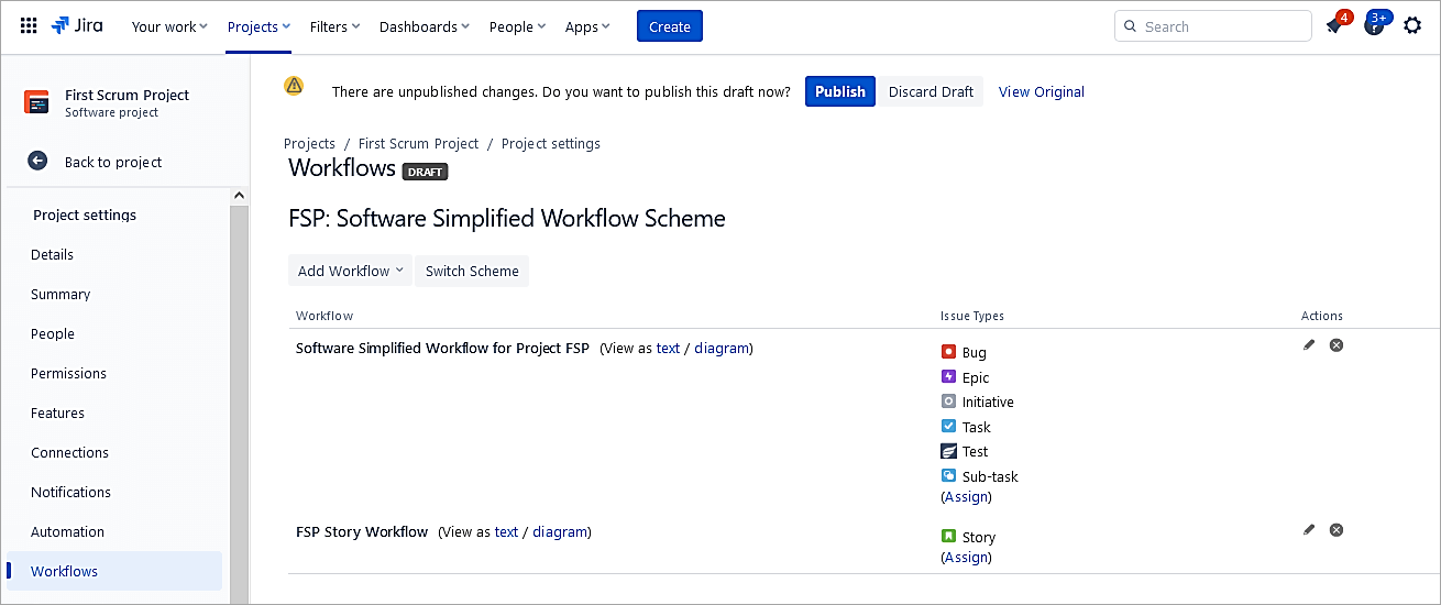 To apply this workflow to the Story issue type, go to Project settings -> Workflows.