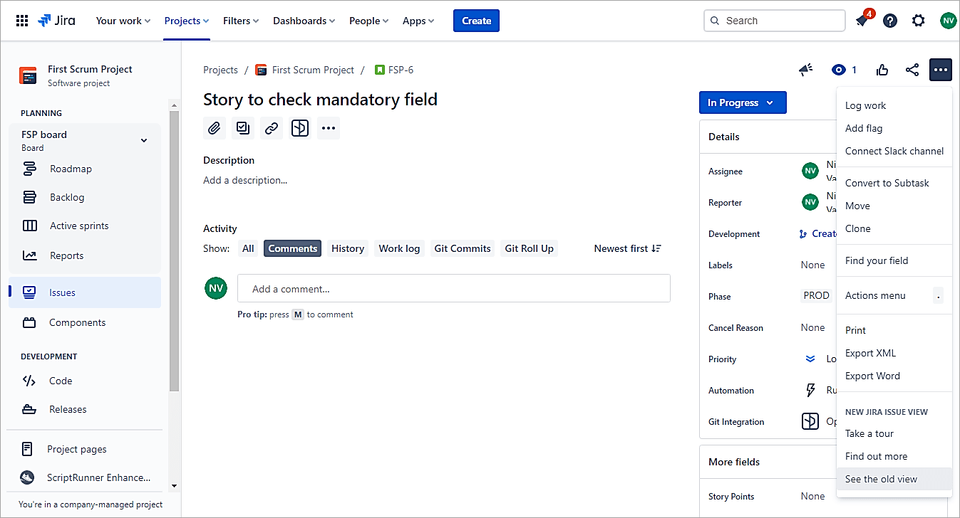 Scenario #1: Open an issue in the old view. Click on 3 DOTS and select See the old view