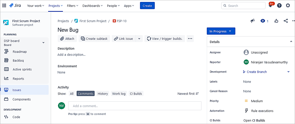 Publish the Draft and test the post function. In the below bug issue, the Assignee is Unassigned.