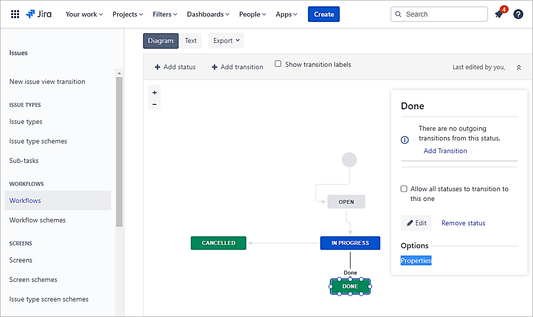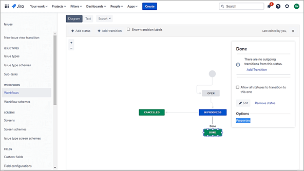 Open the workflow and click on the properties of the Done status