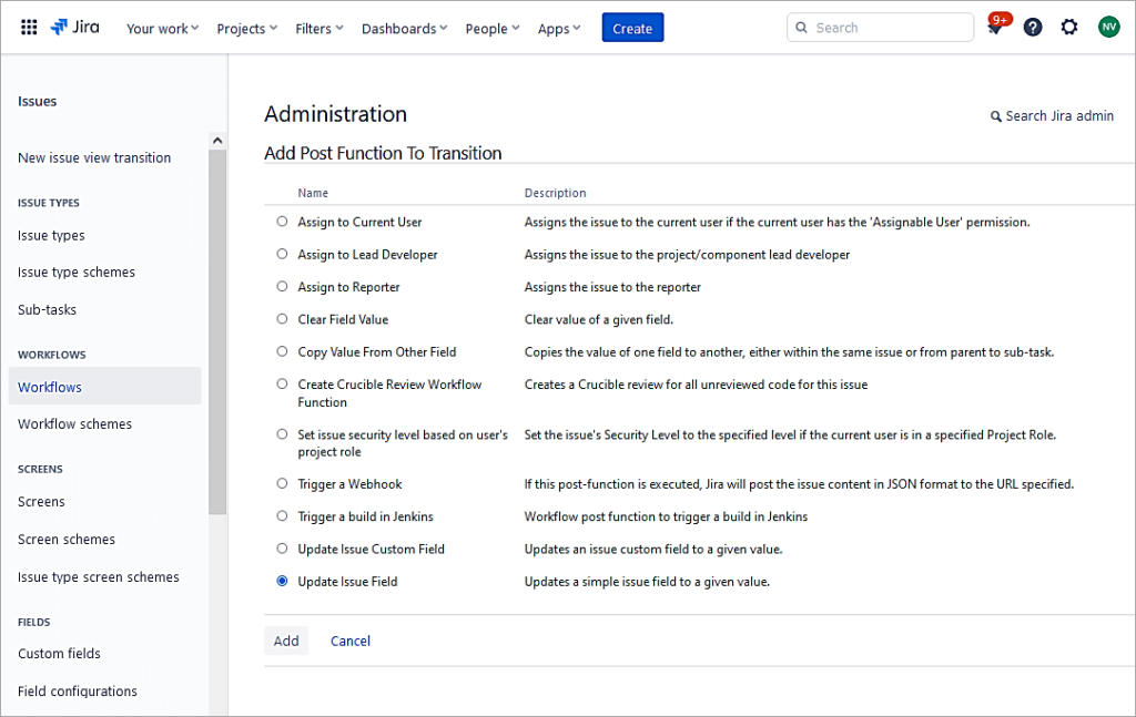 Select the radio button Update Issue Field and click on Add.