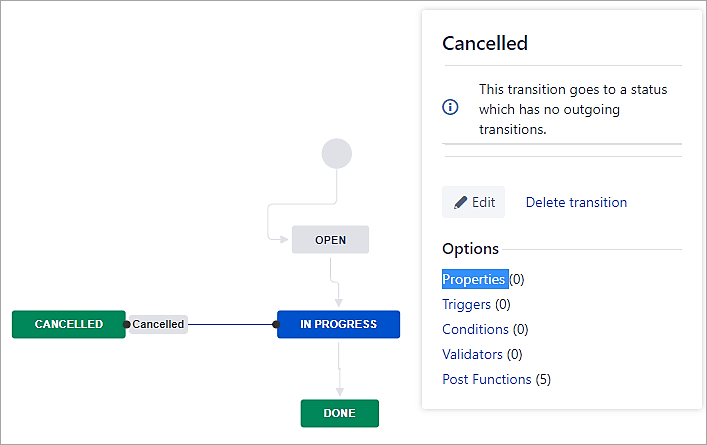 Open the workflow and double-click on the transition for the Cancelled status.