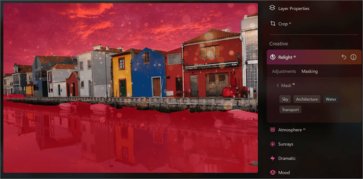 With the mask AI tool, Luminar Neo speeds up the entire masking process. Once selected, the AI identifies and breaks down different elements available in your image. For instance, the AI was able to identify the following elements – water, architecture, sky, and transport in my image.