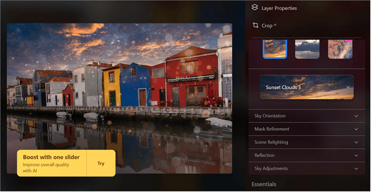 A single click is all you’ll need to replace the sky on your image. You get a ton of options to choose from. Besides replacing the sky, you can adjust the sky’s orientation, lighting, reflections, and more.