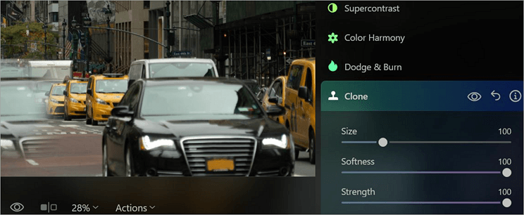 You start by first selecting the object you aspire to be cloned. After doing so, click on the space on the image where you want the replica to appear. You can adjust the clone’s appearance by making some softness and strength adjustments on the slider.
