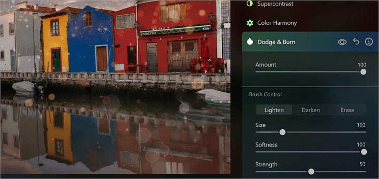 You can easily soften or strengthen your brush to perform your edits with the utmost precision. I found the water reflection in the above image to be a bit dark. So I used the ‘lighten’ brush to brighten that portion of the image.