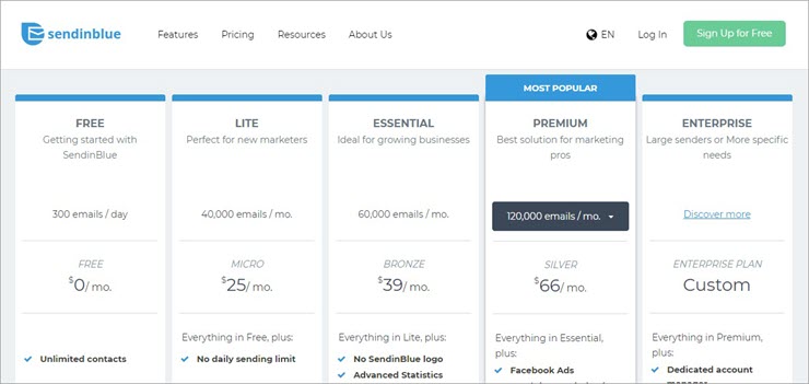 Brevo offers a very cheap and affordable pricing plan when compared to other tools. It offers one free plan and four paid plans i.e. Lite ($25 per month), Essential ($39 per month), Premium ($69 per month), and Enterprise (custom pricing).
