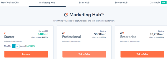 HubSpot offers some free tools. The Service Hub and Sales Hub price also starts at $40 per month. CMS Hub price starts at $240 per month. CMS Hub can be tried for 14 days.