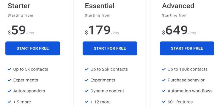 Campaigner offers 3 pricing plans. The starter plan will cost you $59/month. Whereas the essential and advanced plans will cost you $179 and $649/month, respectively. You can try the tool with all of its features for 30 days without charge.