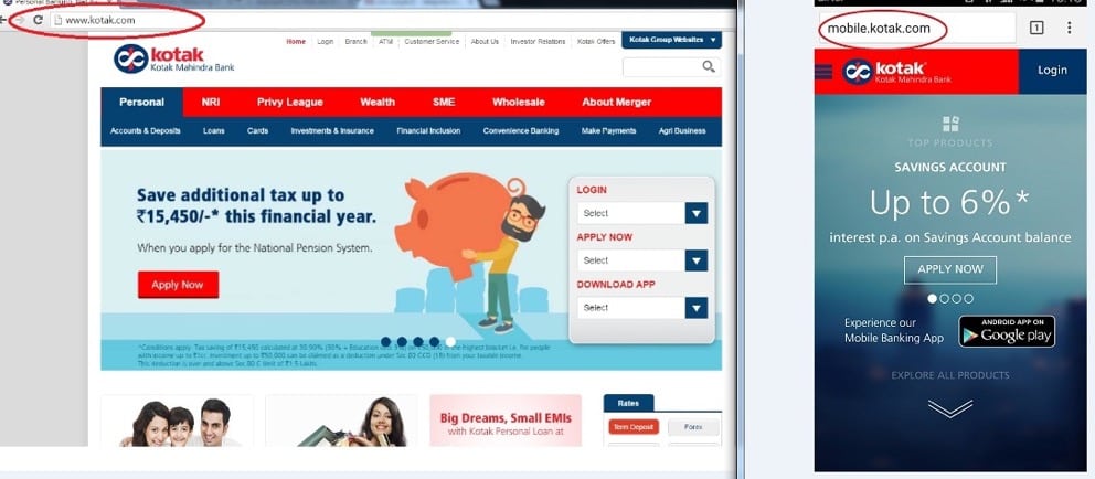 Example: Open the website www.kotak.com from a laptop and also open the same from mobile too and observe the URL in both the devices. The URL is not the same for both the devices.