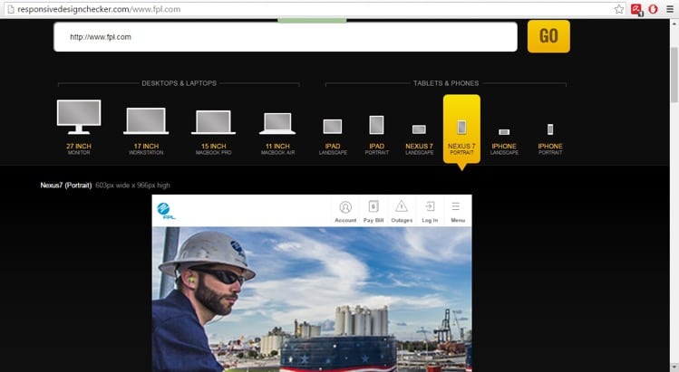 Now enter www.fpl.com in the field, select the layout “Nexus 7 PORTRAIT” and click GO. The site gets displayed in the resolution of the selected format.