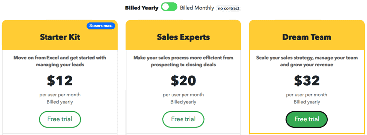 Pricing: noCRM.io has three pricing plans, Starter Kit ($12 per user per month), Sales Experts ($20 per user per month), and Dream Team ($32 per user per month). All these prices are for annual billing, you can also choose a monthly subscription without a contract. A 15-day free trial is available for the application.