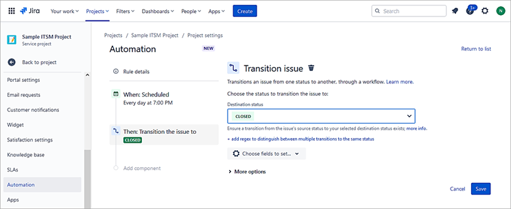 Select the check box “Run a JQL search and execute actions for each issue in the query” and enter the query as project = “Sample ITSM Project” AND status = Resolved and updatedDate <= -3d