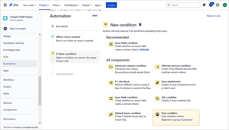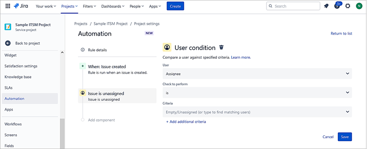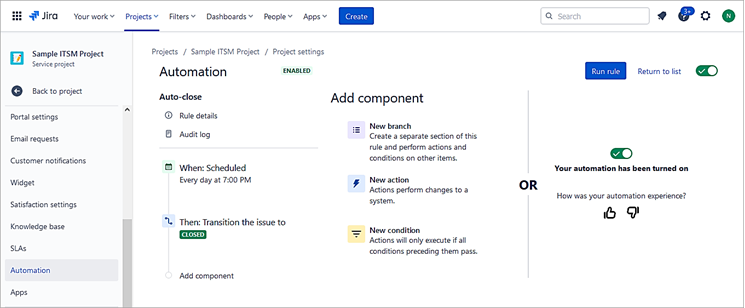 Sometimes there is a need to automate certain manual repetitive tasks within the process. Jira Service Management allows you to automate actions using rules based on certain criteria.