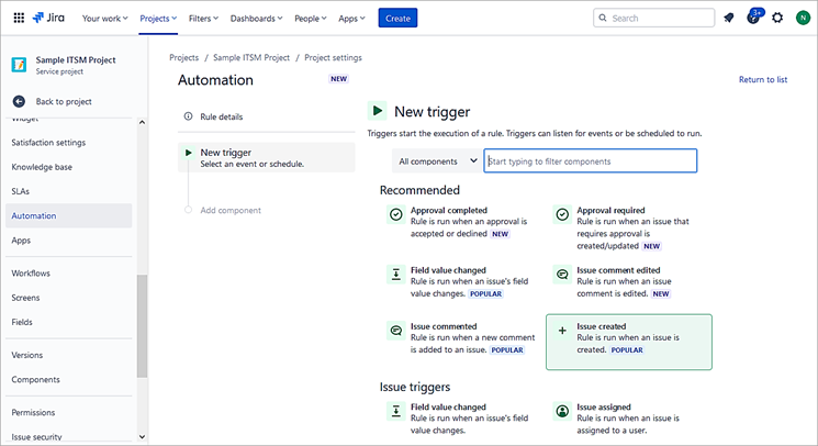 Let’s start by choosing our trigger, which is ‘Issue created’ by selecting Create Rule from Project Settings-> Automation