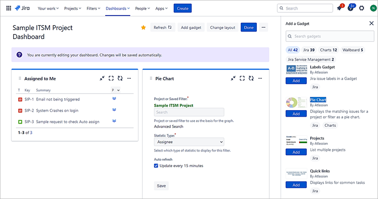 Dashboards are a way to track the issues and their progress. In JSM, you can create personal dashboards and add gadgets to them to keep track of the issues that the project team is working on using charts.
