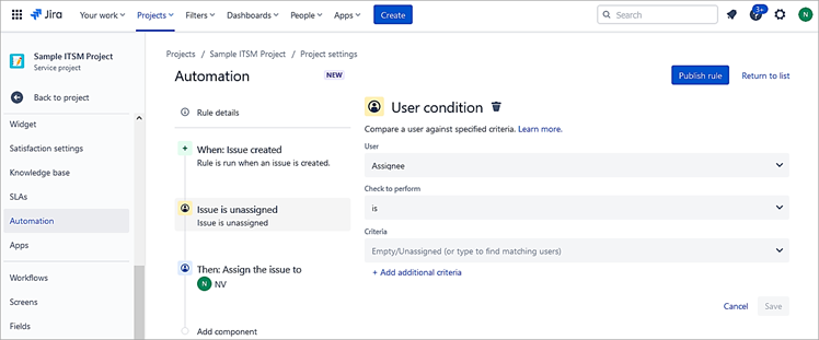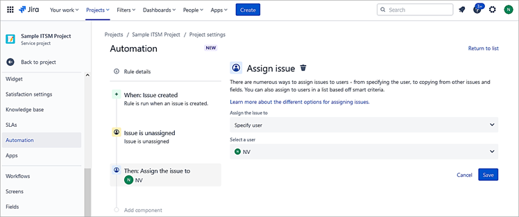 Normally, when an issue is created, there is no assignee. We will create an automation rule to auto-assign to a specific user. An example is that when a request is created by the customer, it should be auto-assigned to a particular point of contact and he/she will then assign it to the right engineer.