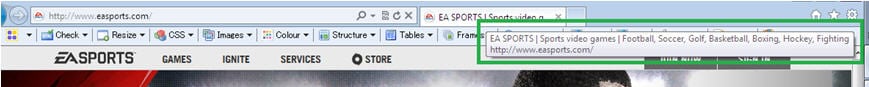 Enter the URL http://www.easports.com and verify the page title in the tab title bar by mouse hovering.