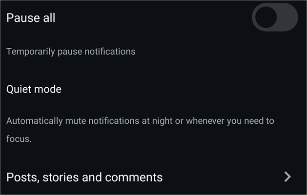 For instance, you can choose to only pause notifications for likes while receiving alerts for direct messages as usual. This proves to be a great alternative for Quiet Mode on Instagram, especially if you wish to pause specific alerts only.