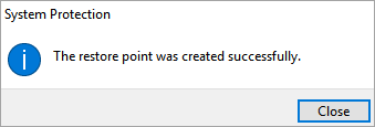 #7) A message will occur stating, “The restore point was created successfully.” as shown in the image below.