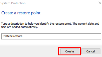#5) Enter the name for the restore point in the dialog box and click on “Create” as shown in the image below.