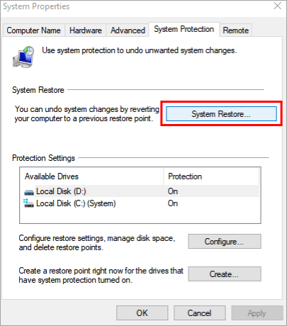 #2) The Restore point window will open. Click on “System Protection,”. Now, click on “Configure…” as shown in the image below.