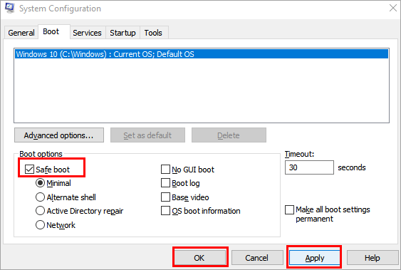 #3) Click to select “Safe boot” as shown in the image below. Click on “Apply” and then “OK.”