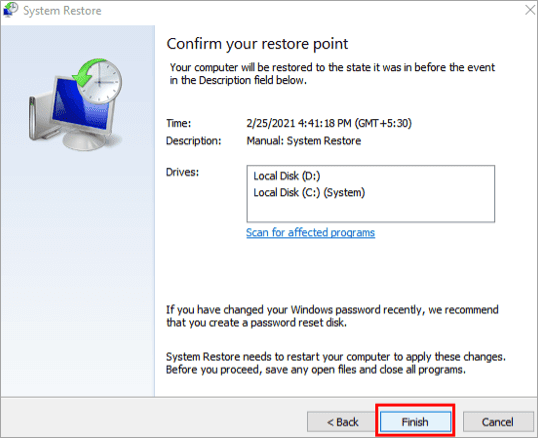 #7) Click on the “Finish” button to restore the system image.