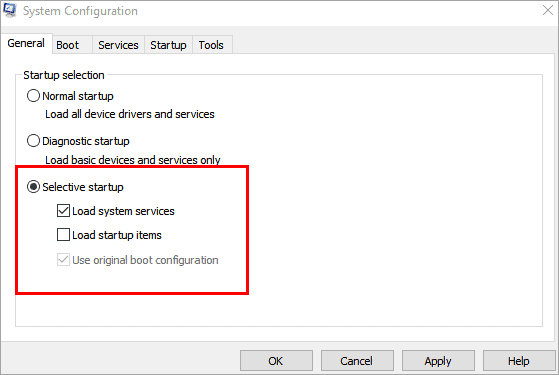 click on "Selective startup"
