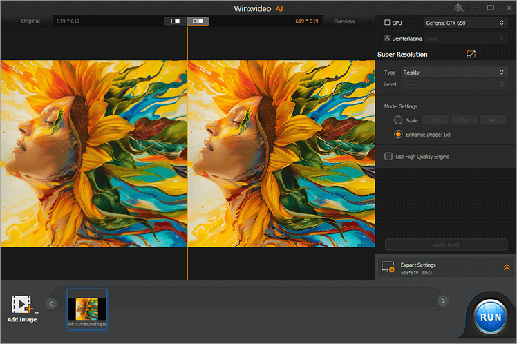 To start the image enhancement process, simply click on the RUN button located at the bottom right. After it finishes, you can review the enhanced image’s effects either in the designated save folder or the preview window.