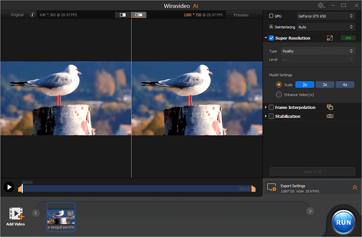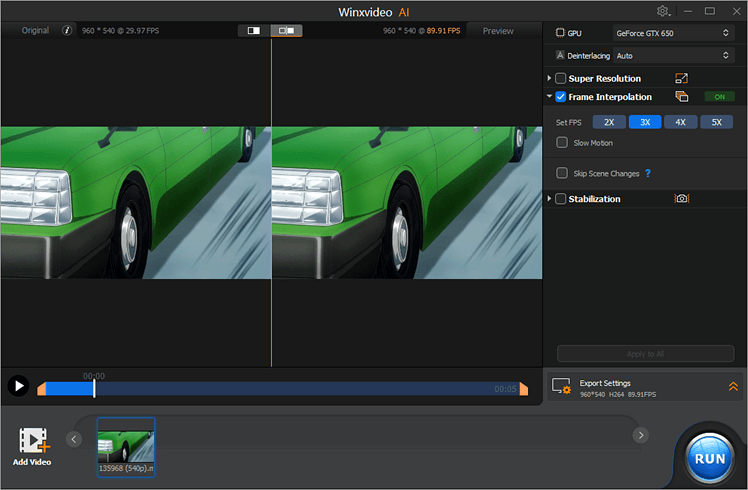 Winxvideo AI helps enhance the smoothness of video motion and transitions with the AI Frame Interpolation feature, which can automatically create and add additional frames between intermediate frames. Thus, it is possible to increase the video frame rate from 24fps and 30fps to 60fps or even higher rates, like 120/240/480fps.