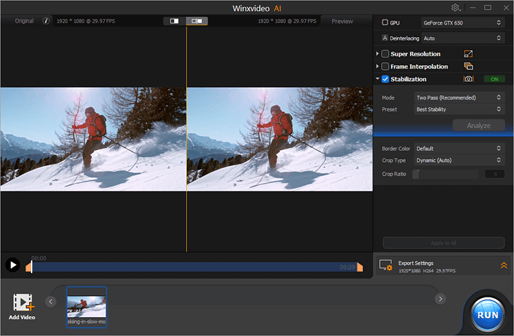 With the help of CineAI technology, Winxvideo AI can automatically analyze the motion orbit of a video and how a video gets shaky. After you choose one of the stabilization modes or presets, it can automatically adjust the camera’s position and minimize any unwanted shaking of your video as much as possible.